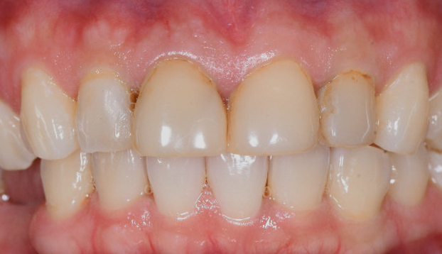 | 症状 | 左上前歯に色調、形態が不良な被せものが入っています。 歯肉の形態も左右対称ではありません。 |