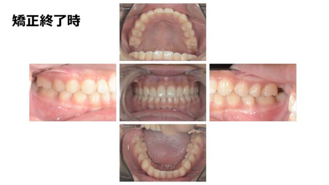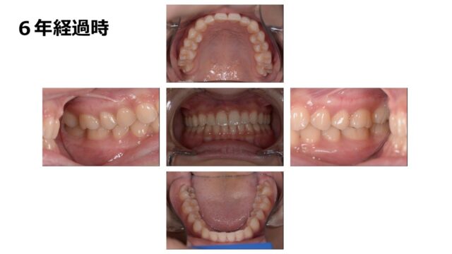| 備考 | 矯正終了から6年経過してもかみ合わせ咬み合わせは安定しています。 第2大臼歯もしっかりと噛み合っています。 7歳から適切な時期に矯正治療の介入を行い、 MFTにて舌癖などの改善を行ったことが 良好な経過につながっていると考えます。 予防もできているので虫歯は1本もありません。 |
